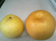左が『二十世紀』、右が『新高』ですが、確かに言われてみれば、皮の色が違いますね(大きさもかなり違いますし)