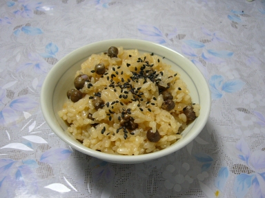 色と風味付けに少し醤油を加えて炊き込みます。