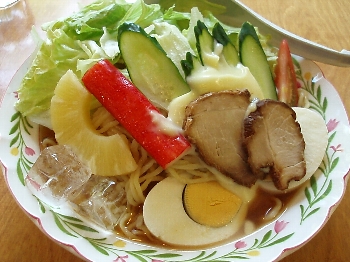 肉関係は脂身の少ないものが冷やし中華には適しているので、さっぱり塩味の薄切りロースハムが最も無難だと思いますが、バンバンジーの鳥肉の例もあるし、冷しゃぶの豚肉の例もありますから、何もロースハムだけというものではありません。