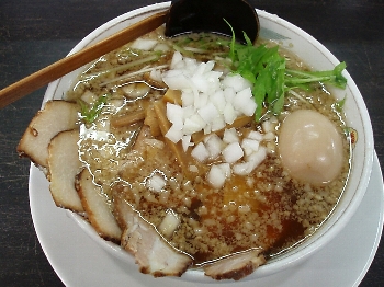 個人的には平うち麺はおいしいと思いませんが、評判は決して悪くないようです。このときはチャーシュー麺に煮卵で千円の豪勢さ。チャーシューは肉の触感の残る私好みのチャーシュー。煮卵もうまい。麺の量が心持少ないかな。