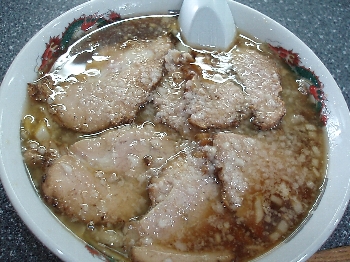 チャーシューはロース肉。肉質は硬めで、ぱさつき、たれに漬け過ぎたせいか味が濃く、見た目がおいしそうなだけに残念でした。