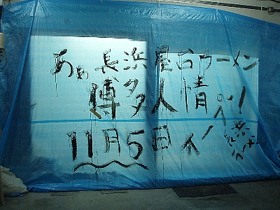 二軒目は長岡殿町に11月5オープン予定の「ああ長浜屋台ラーメン博多人情」ここは前「かあちゃんらーめん」があったところではないかと思いますが、向かいに「与華楼」をはさんだ通りは、殿町から柿川へと抜けます。