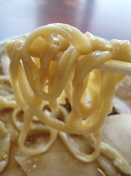 繰り返しになりますが、杭州飯店の麺の特徴は極太。ちぢれのほとんどないストレートですが、不揃いな太さが縮れ以上に食感を豊かなものにしています。柔らかなようでいて、ちゃんと麺のコシが残っています。