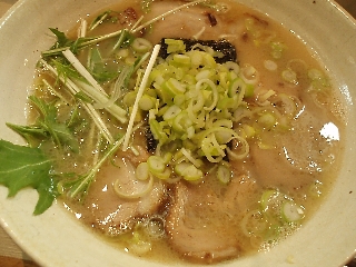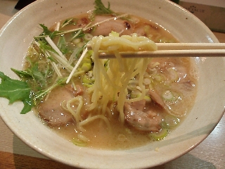 盛り付けが前と変わり、ネギをノリの上に載せたり、ミズナ添えて見た目にも気をつけているように思えました。見た目だけからすれば、とんこつにみえます。鶏塩ラーメンですから、鶏からスープを取っているのでしょうね。