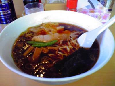 すごく真っ黒な醤油色のスープはショウガ風味のいわゆる長岡系。