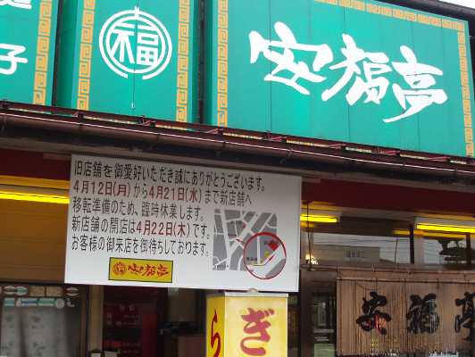 移転の準備に伴って、4月12日から21日まで休みになるようです。開店予定は4月22日。安福亭千手店へ出かける予定の人は要注意ですね。