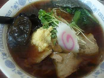青島が近いこともあり、三つのスープの中から醤油を選らんだこともあって、青島みたいなラーメンがでてくるイメージがありました。スープの色は濃口醤油の特有の色。中央のナルトに最初に目が行ったときは、青島そっくり。しかも、焼きノリ、ホウレン草もあるのもそのままの第一印象。よくよく眺めると、そのわきにたっぷりのおろししょうが。これがしょうがラーメンのネーミングの由来と納得。