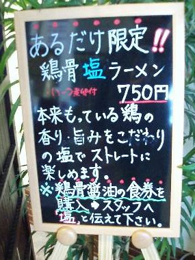 この「あるだけ限定 鶏骨塩ラーメン」(750円)は変則的な注文の仕方なので、注意が必要かもしれません。私はボード通りに従い食券を購入して、スタッフに「塩」と一声オーダーしたのですが、このスタッフさんが「にごり塩ラーメン」(700円)と勘違いしたらしく、しばらくして50円黙って渡してくれましたが、こちらは一瞬きつねにつままれた気分。はたと気づき「頼んだのは『あるだけ限定 鶏骨塩ラーメン』です」と念押しし再度50円払うことに。注文の際は「あるだけ限定 鶏骨塩ラーメン」と誤解が双方におこらないように念を入れたほうがいいかもしれません。