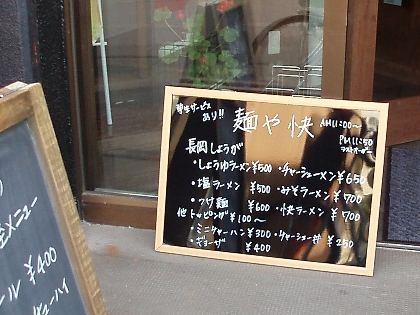 7月1日の夕方、4月30日オープンの「麺や快」前を通ると、タテカンに店舗情報が出ていました。予定があったので実際に入店することができませんでしたが、それによると以下の通り。
