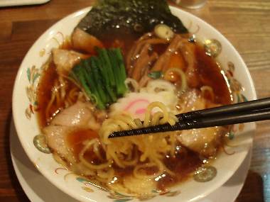 照明のせいか、スープは褐色がかって見えます。タレに醤油が多めなのでしょうか。一口。ちょっと塩っぱい。濃さはうまいと感じる濃度の微妙な境界にあるようで、時々塩味が強く感じることも。