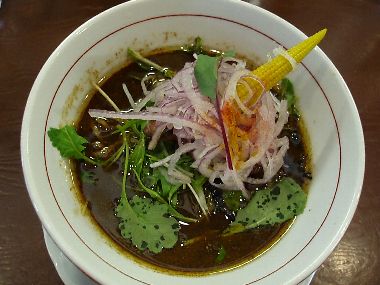 3×2㎜ほどの縮れの強い平打ち麺は多加水麺ながらコシもあり、食感も心地よい。スパイシーで濃厚なスープをまとってあめ色に。