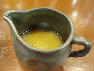 時間差で割スープが提供されます。これは鶏骨スープに刻まれた柑橘系の皮(ミカンかな?)で仕立てられています。割スープと言いながら、かなり濃厚。きっちりした味付けで、量も少なめ。スープの味の変化を楽しむアイテムなのですが、アイテムという言葉を超えた期待以上。もとのスープの残りぐあいによるでしょうが、柑橘の風味と鶏骨スープのうまみが加わることで別物のスープを味わうことができ、塩のスープがいかに繊細だったのかに気づかされます。