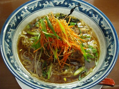 トッピングは人参が主の千切りの野菜陣。切り方のせいか、いつも感じるラーメンとの違和感もなく、むしろ良いアクセント。