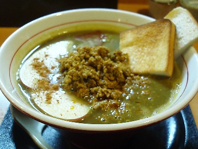 トッピングは肉そぼろ、トースト、薄切りリンゴ。リンゴは色の着かないように砂糖水でコーティングしたのか、ちょっと果物とは別の甘さ。さらにシナモンパウダーが振り掛けられています。