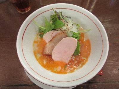トッピングはいかにも青桐らしいフレッシュ野菜、鶏2枚と豚1枚のチャーシュー、彩りの糸唐辛子。