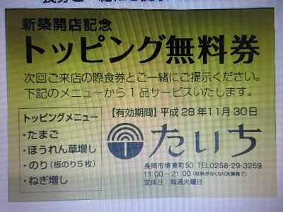 たいちのホームページにアクセスすると(http://www.taichinoodle.co.jp/)、新装オープン記念の「トッピング無料券」を手にできるお得情報あり。