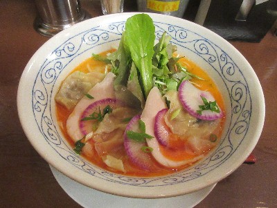 トッピングは紅大根のスライス、葉物野菜、ネギ、鶏チャーシュー、ワンタン。
