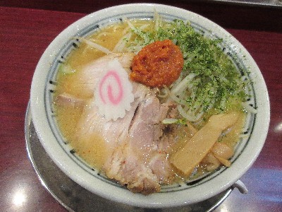 店一押しは、からし味噌らーめん。うたい文句は「鶏ガラと煮干しのWスープ。鶏油をプラスする事でコクのある濃厚スープに」