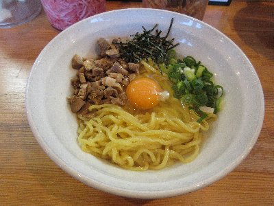 醬油ベースのたれとスープと生卵を混ぜて絡めた麺の味は濃いめ。この手の味付けの料理の多くと同滋養に、このまぜそばもジャンクフード感たっぷりな単純で単調な旨さ。