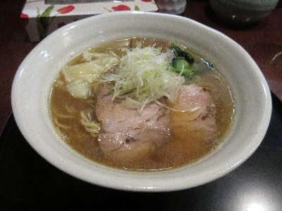 トッピングは チャ-シュー、白髪ねぎ、青菜、メンマ、ワンタン。