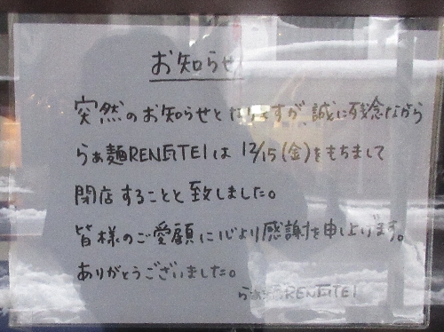 煉瓦亭が1月7日に休業したまま閉店した後、1月下旬にらぁ麺REN瓦TEIとし開店したが、約11ヵ月で閉店。告知文を見る限り、急な閉店らしい。