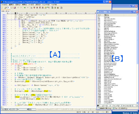以下の画像は、このエリア0258のシステム(CGIスクリプト)を編集(【A】)しているところです。スクリプト言語がPerlの場合、F11(ファンクションキー)で簡単に関数の一覧表示(【B】)も可能です。