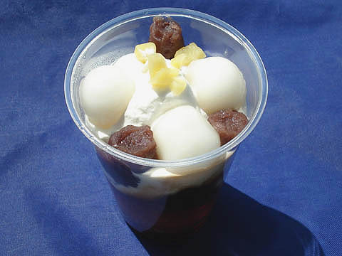 このスイーツは黒糖の寒天の上に生クリームの層があり、その上には写真のように、こしあんの玉、白玉、栗が乗っかっています。これを冷しておくと、黒糖の寒天を口の中に入れたときに冷んやりとしますので、この時期にピッタリのスイーツなのです。また、黒糖の寒天がたくさん入っていますので、ガッツリ食べたいというときにはとてもオススメです。