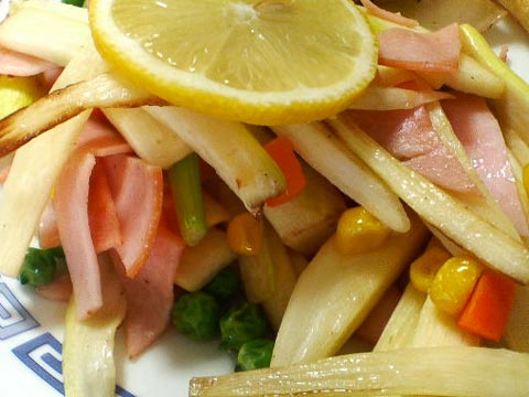 今年も中之島の方からマコモタケを戴きました。出来は今一だったという事ですが、簡単に油炒めにしていただきました。イネ科の植物だったと思います。味はなんとなくスイートコーンの様な甘い香りがし、タケノコのようなキノコのような歯ごたえがあります。あっさりとしていて煮ても焼いても、生でも食べられますが、塩味であっさりと油炒めにするのが香りと歯ごたえが生きて美味しいと思います。彩りが寂しいので冷凍のミックスベジタブルを入れたが余計だったかもしれません。