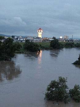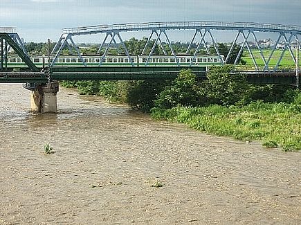 ニュースで各地の大雨の被害が報道されています。信濃川でも警戒水域に達したそうです。越路橋から信越本線の走る鉄橋を見ると、かなり増水したことがわかります。濁流に混じって大きな材木やごみが流れていました。葉の茂ったままの樹木も流れていることから、上流での雨の状況が心配されます。
