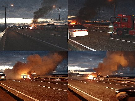 長岡大橋の東詰のあたりから、元の水道処理場のほうを見ていたら、橋の途中で火の手が上がりました。2台の追突車両が燃え出したようです。7時20分頃でした。パンパンとはじける音がして、火の勢いが凄まじくて「けが人がなければよいが」と思いましたが、しばらくして駆けつけた消防車によって消し止められたので、ちょっと安心しました。