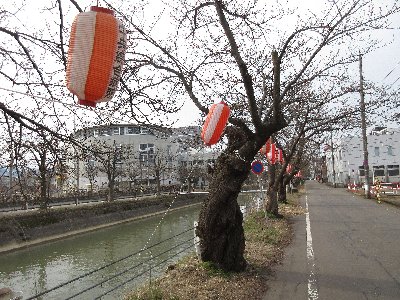 ぼんぼりは3月26日に設置完了。コロナ対策を呼び掛けるタテカンも同時に設置。