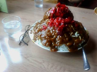 この量で普通盛り。ご飯を盛った上にまんべんなくキャベツを敷き、その上にカツを置いてカレーをかけてあります。値段も1000円と量の割に安いです(ちなみに大盛りは1300円でした)。ルーは甘口で食べやすかったのですが、さすがに量が多く、ご飯の割合に対してルーが少なく、最終的にご飯とキャベツだけが残り、結局残してしまいました。食べ物を残すなんて何年振りだろう・・。一緒に行った仲間は完食していました。もう当分カレーはいいや、とのこと。