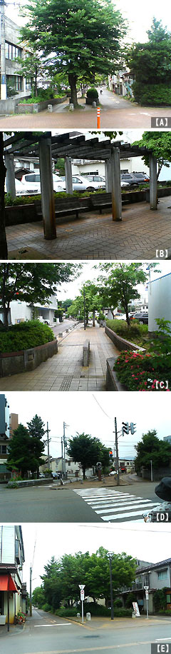 かつて長岡駅の東口からは悠久山へ向かう電車があり、線路が引かれてたと話を聞きました。長岡高校近くは「こうこうまえ」、新潟大学の工学部のあったあたりは「だいがくまえ」という駅も存在していたようです。線路は既に無くその一部はちょっとした散歩道として整備されています。福島江近くから中央図書館近く交差点の手前までです。2006年の6月中旬の様子を撮影してきましたので簡単に紹介します。【A】福島江から東南の方向