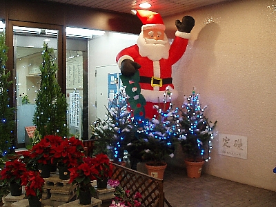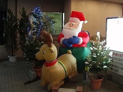 立川病院の飾り付けは、二人のサンタも登場するなかなか華麗な見ものです。いつも通りかかると、つい足を止めてしまほど、堂々たる恰幅の巨大サンタさんたちです。