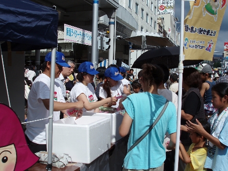 佐渡の桃太郎アイスをお店の方がキャンディーを振舞われてました。炎天のもとひときわおいしく感じました。おまけに無料でしたしね。