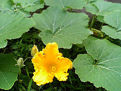 スーパーで購入したカボチャの種が育って花が咲きました。結構鮮やかな黄色です。実のならない花のようですが、見ていて少し楽しいです。ところで最近は食べられない巨大なカボチャを作って持ち寄り楽しむ催しなどが全国各地でチラホラとあるようです。知り合いから聞いた話だと小千谷市でも巨大カボチャのコンクールが毎年行なわれているそうです。ネットで検索すると長岡市の老舗のお菓子屋『紅屋重正』さんのBlogが該当しました。