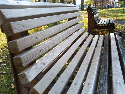 10月31日快晴。長岡市学校町1丁目の中央図書館の南側に小さな公園があります。ぶらっと散歩してきました。ベンチが修理されていて、木の新しい香りがしました。
