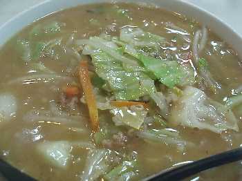 とにかく大量のスープが熱い。しかも濃厚。といっても、スープはさらっとしています。実際に見たわけではないのですが、スープ作りを推測するに、中華ナベに多めの油にショウガのみじん切りを入れて香りを立たせたところへ豚のひき肉を炒め、次に野菜にざっと火を通したらスープを注ぐのだと思います。これで油を含めすべての素材がスープと一体化してコクとうまみを出すんでしょうね。
