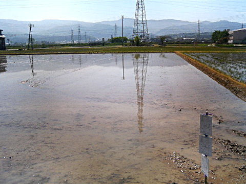 今日は2008年の5月3日。数年前から市内の近所の田んぼでは5月の連休で田植えしていたのを少し遅らせています。米の品質向上の為という事らしいです。今までは小さな苗が見られた近所の田んぼは、トラクターなどでの代掻きの真っ最中でした。