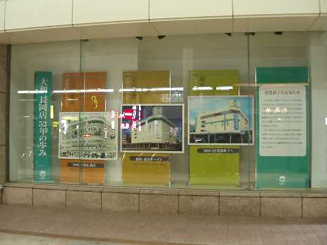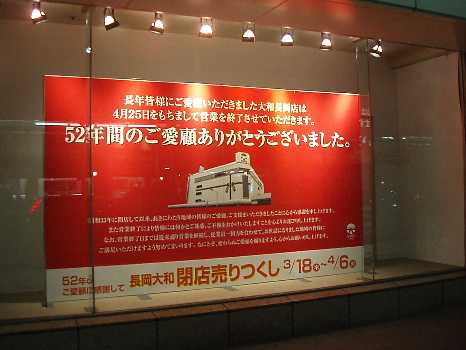 ついに一週間後の4月25日に大和長岡店が閉店になります。大和のショーウィンドーには52年の大和長岡店の移り変わりを記した案内が掲示されています。長い間ご苦労様。